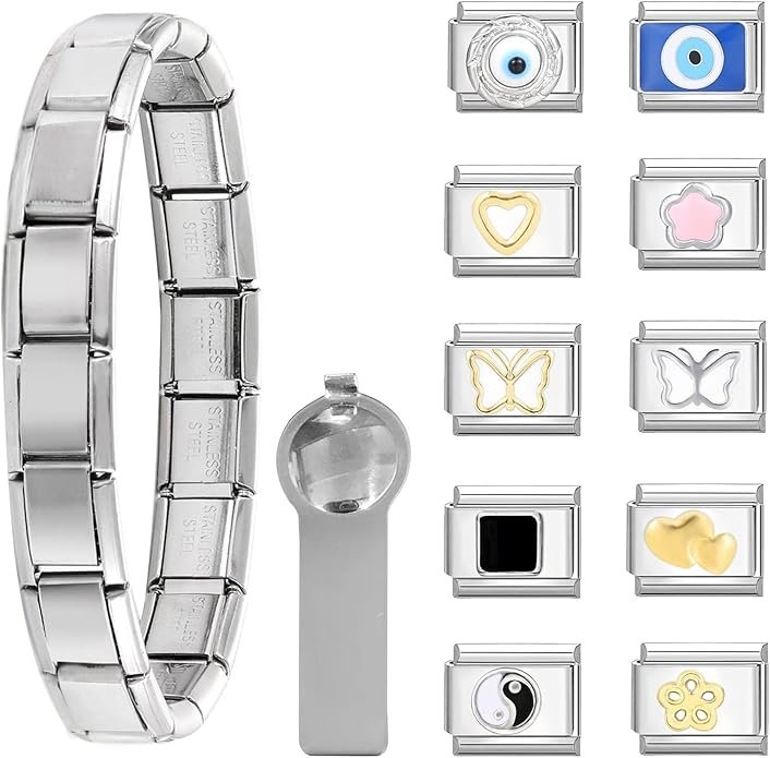 - Ideal Bracelet and Tools: you will receive 1 Classical Itallan style charm braclet, 1 thumb charms tools, 10Pcs Popular 10mm*9mm Italian Charms; Each tool measures about 2.17 x 0.51 inches/ 55 x 13 mm,which is suitable for most bracelet sizes. It can complete the stitching of all 9mm accessories and can be interchanged and combined with other Italian Charms